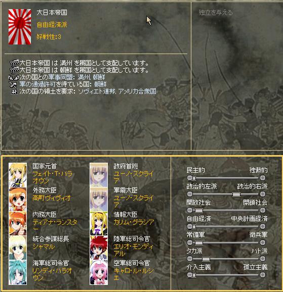 プレイヤー的には自由主義で民族自決を強調するから、植民地としての併合プレイはしない予定らしいよ。ただ、統一朝鮮の国家元首が李承晩になってるけど、大の日本人嫌いがなんで、日本と同盟結んでいるのか不思議でならないよ」