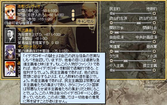 「日本が自由主義国家になって、アメリカとの関係は+150にまであがってます。フェイトさん。でも、最大の200にしても、アメリカは孤立主義なので同盟ができません」